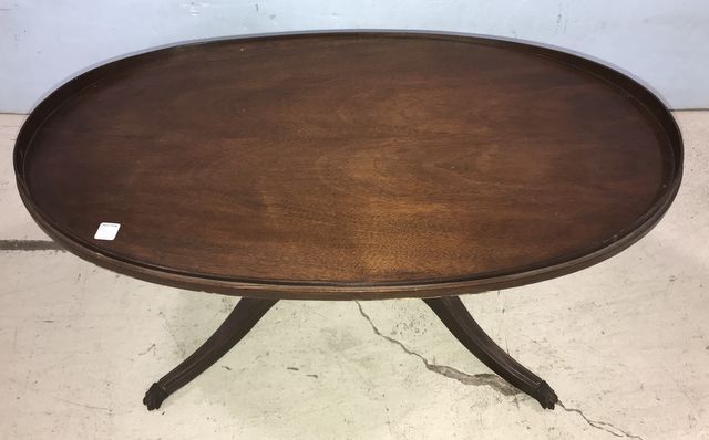 Duncan Phyfe Harp Pedestal Coffee Table, dark mahogany, brass claw footed, oval top, has finish wear, side wood splits on top, 15"h., 35"w. Duncan Phyfe Harp Pedestal Coffee Table, dark mahogany, brass claw footed, oval top, has finish wear, side wood splits on top, 15"h., 35"w.