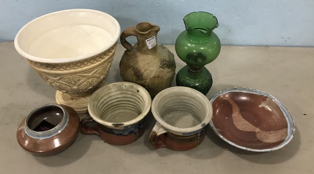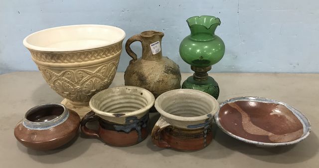 Ceramic planter vase, stoneware bowls, vases, jug, and vintage green glass oil lamp. Ceramic planter vase, stoneware bowls, vases, jug, and vintage green glass oil lamp.