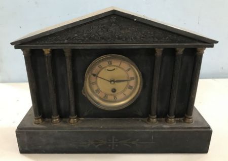 Vintage Slat French Style Mantle Clock, needs cleaning, some small damage, battery operated dial, 12"h., 15"w. Vintage Slat French Style Mantle Clock, needs cleaning, some small damage, battery operated dial, 12"h., 15"w.