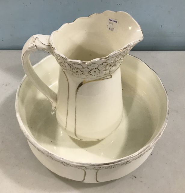 Vintage Porcelain pitcher and bowl, white with gold gilt trimwork, good condition. Vintage Porcelain pitcher and bowl, white with gold gilt trimwork, good condition.
