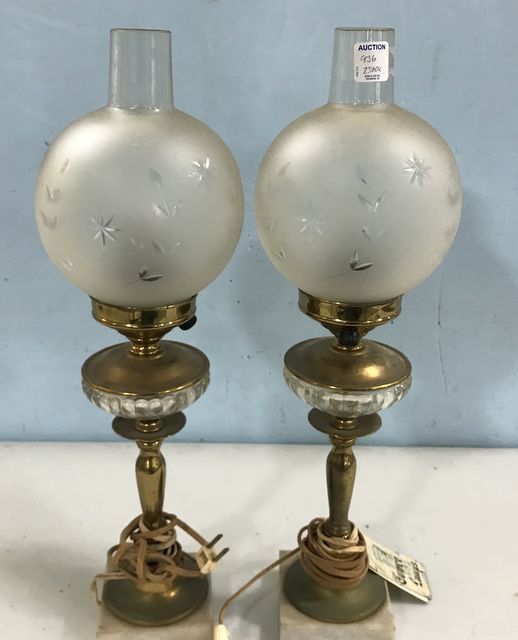 Pair of Vintage Brass Globe lamps, etched frosted glass globes, marble bases, good condition, 20"h. Pair of Vintage Brass Globe lamps, etched frosted glass globes, marble bases, good condition, 20"h.