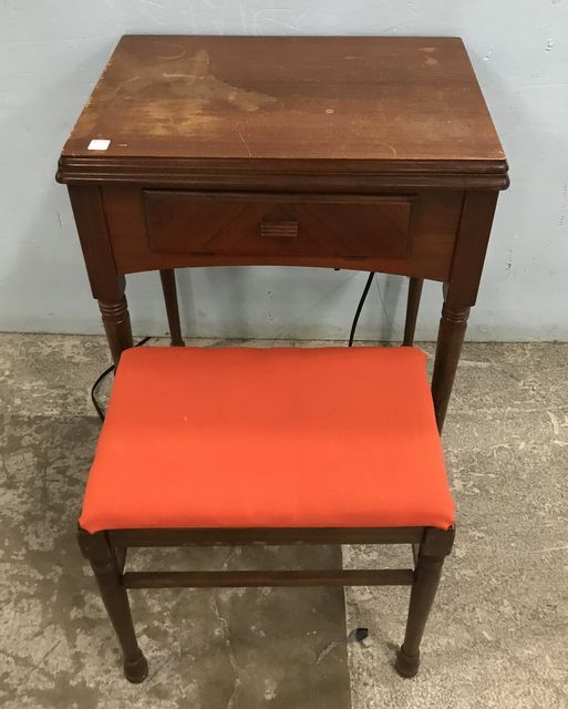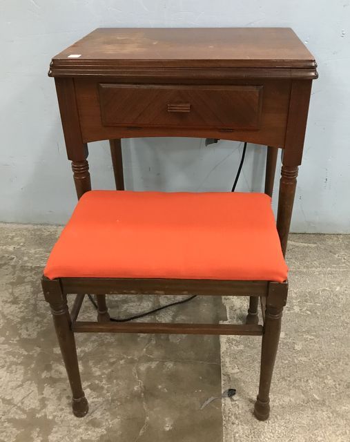 Mahogany Single Sewing Cabinet with Singer Sewing Machine, included bench, 30"h., 23"w. Mahogany Single Sewing Cabinet with Singer Sewing Machine, included bench, 30"h., 23"w.