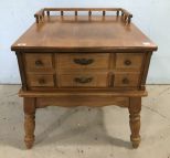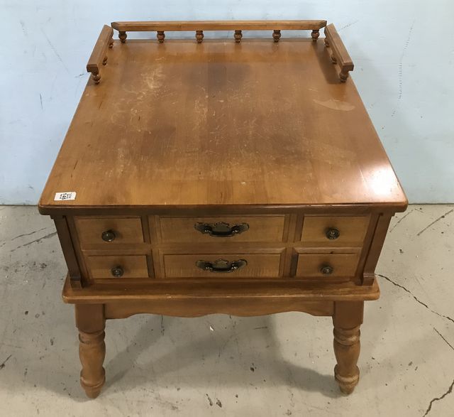 Vintage maple end table, spindle gallery, single drawer, has worn areas on top, 23"h., 23"w., 25"d. Vintage maple end table, spindle gallery, single drawer, has worn areas on top, 23"h., 23"w., 25"d.