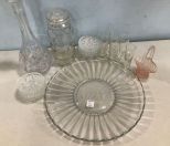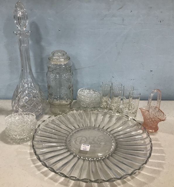 Group of Serving glassware, clear glass decanter, pressed glass coasters, round platter, basket, small cups. Group of Serving glassware, clear glass decanter, pressed glass coasters, round platter, basket, small cups.