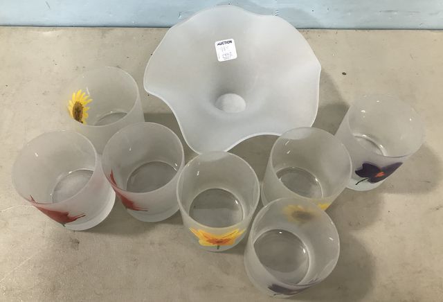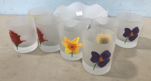 Frosted Glass cups with flower painted, 7 total, and crimped rim bowl 2 1/2"h., 8"dia. Frosted Glass cups with flower painted, 7 total, and crimped rim bowl 2 1/2"h., 8"dia.