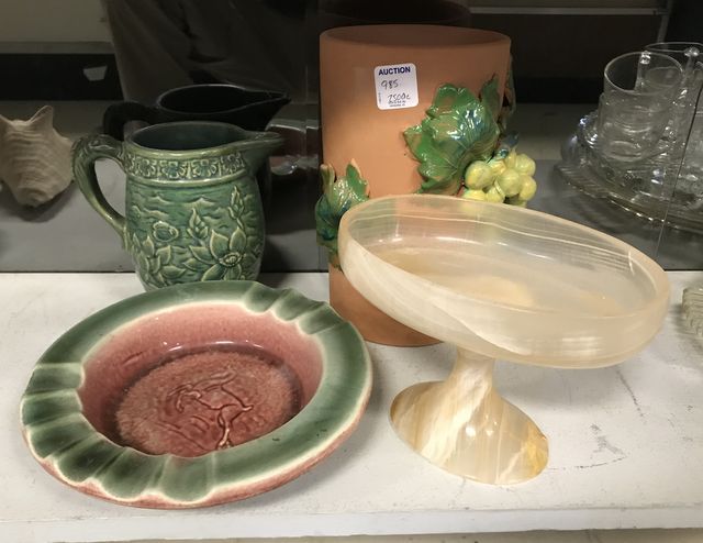 985 Pottery Vase, Green Pitcher, Cigar Ashtray, Glass Compote.