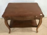 French Style Cherry Side Table, two tier, light finish wear, 21"h., 28"w. French Style Cherry Side Table, two tier, light finish wear, 21"h., 28"w.