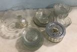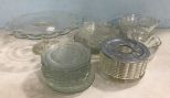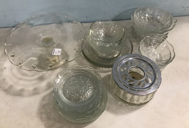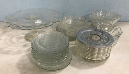 Collection of Clear Glass Serving Pieces, cake stand, pressed bowls, plates, small plates. Collection of Clear Glass Serving Pieces, cake stand, pressed bowls, plates, small plates.