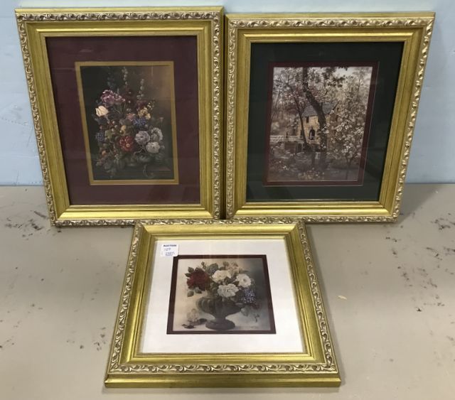 Three Gold Gilt Frame Prints, flower bouquet, water mill, 12"h., 10"w. Three Gold Gilt Frame Prints, flower bouquet, water mill, 12"h., 10"w.