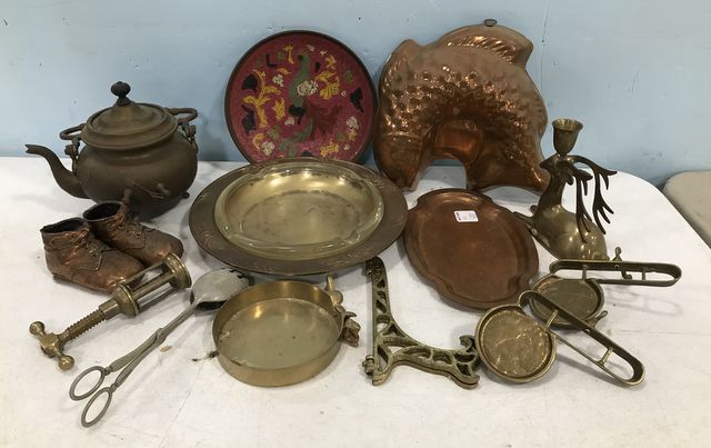 Brass kettle, round plate, dish, fish decor, wine opener, vintage shoe, easels. Brass kettle, round plate, dish, fish decor, wine opener, vintage shoe, easels.