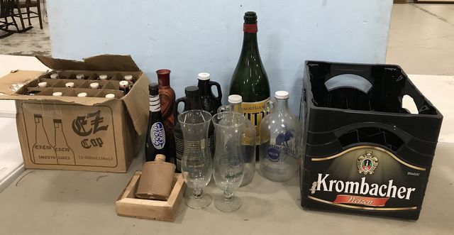 Collection of glass beer bottles, and assorted style wine bottles and decanters. Collection of glass beer bottles, and assorted style wine bottles and decanters.