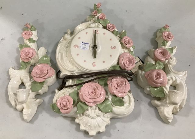 Three Hand Made Ceramic Wall Clock and Side Pieces, made by Lorine Dowing, roses, hand painted, 15"h. Three Hand Made Ceramic Wall Clock and Side Pieces, made by Lorine Dowing, roses, hand painted, 15"h.