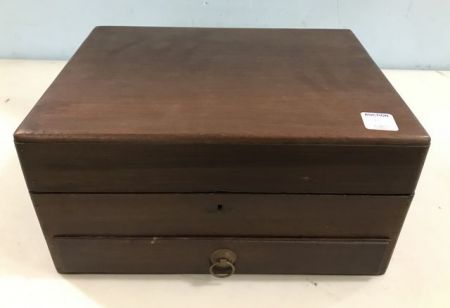 Mahogany Storage box, lift top, felt lining, single drawer, 6"h., 12"w. Mahogany Storage box, lift top, felt lining, single drawer, 6"h., 12"w.