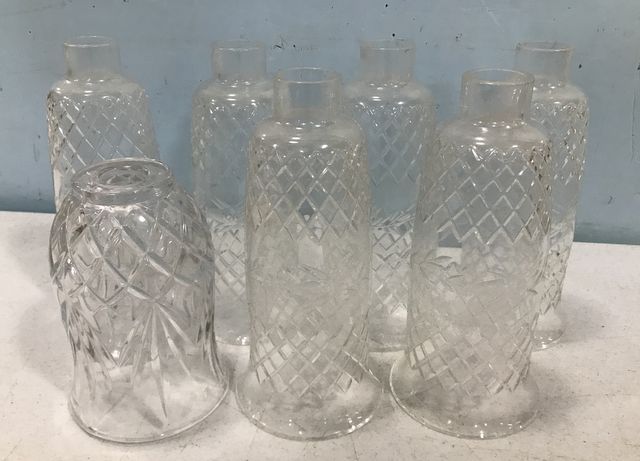 Set of Decorative Glass Candle Shades, pressed and etched shades, 7 total, 9 1/2"h. Set of Decorative Glass Candle Shades, pressed and etched shades, 7 total, 9 1/2"h.