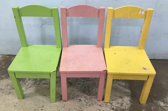 Three Child's painted, green, pink, yellow, chairs, need work, 21"h. Three Child's painted, green, pink, yellow, chairs, need work, 21"h.