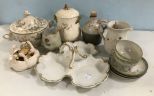 Assorted Group of Pottery and Porcelain, hand painted covered dish, stoneware pottery jug, geese planter, Oriental cups and saucers, Limoge serving tray. Assorted Group of Pottery and Porcelain, hand painted covered dish, stoneware pottery jug, geese planter, Oriental cups and saucers, Limoge serving tray.