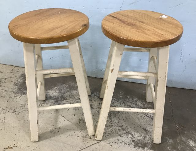 Two pine round top bar stools with white base, 24"h. Two pine round top bar stools with white base, 24"h.
