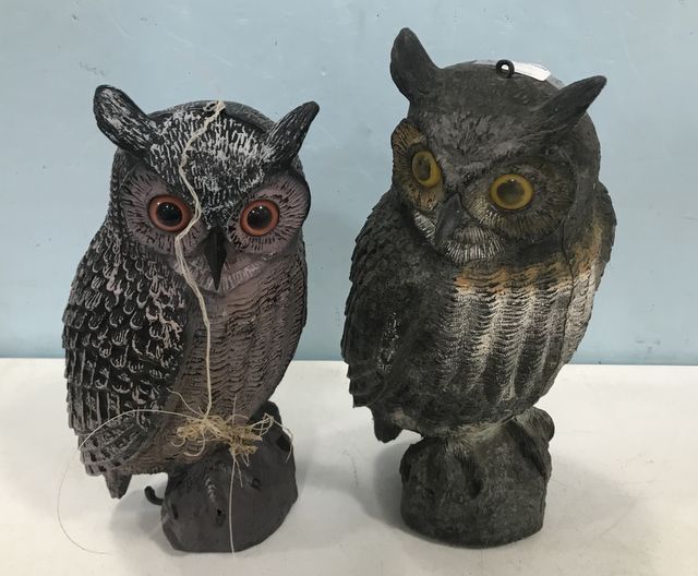 Two plastic owl decoys, used condition, 16"h. Two plastic owl decoys, used condition, 16"h.