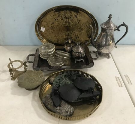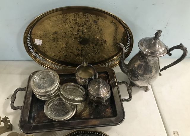 Silver Plate footed pitcher, creamer, sugar, handled silver plate serving tray, coasters, brass oval tray, round tray, candle stand, and decor. Silver Plate footed pitcher, creamer, sugar, handled silver plate serving tray, coasters, brass oval tray, round tray, candle stand, and decor.