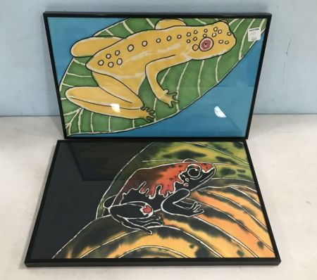 Two Frog Paintings of Cloth, framed, 11"h., 17"w. Two Frog Paintings of Cloth, framed, 11"h., 17"w.