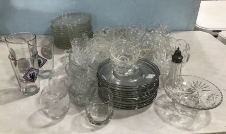 Large Clear Glass Serving Collection, apple plates, bowls, silver plate rimed plates, dishes, cups. Large Clear Glass Serving Collection, apple plates, bowls, silver plate rimed plates, dishes, cups.