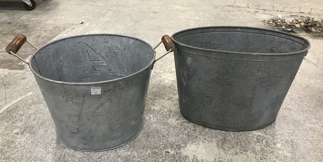 Two Galvanized Metal Buckets, one has handles, 11"h., 16"w. Two Galvanized Metal Buckets, one has handles, 11"h., 16"w.