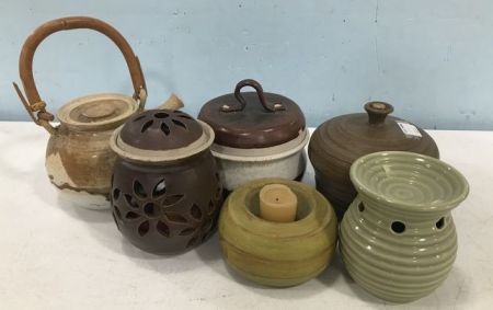Stoneware pottery pots, pitcher, and pottery candle holders. Stoneware pottery pots, pitcher, and pottery candle holders.