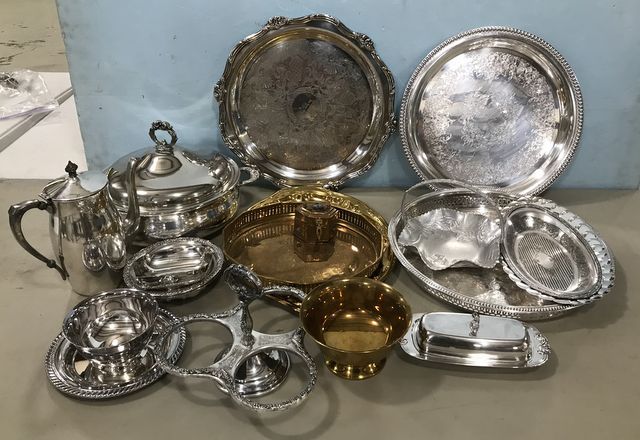 Group of Silver Plate Serving Pieces, trays, brass tray, covered tureen, silver plate pitcher, canister holder, bowls, butter dish, basket. Group of Silver Plate Serving Pieces, trays, brass tray, covered tureen, silver plate pitcher, canister holder, bowls, butter dish, basket.