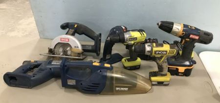 Jig saw, vac, handle saw, drills, light, has battery and chargers, working condition, used. Jig saw, vac, handle saw, drills, light, has battery and chargers, working condition, used.