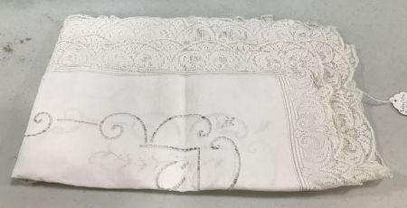 Tablecloth Madeiral Portugal Filet Lace & Blue Cutwork Ca. 1930's, some repair, 74" x 92". Tablecloth Madeiral Portugal Filet Lace & Blue Cutwork Ca. 1930's, some repair, 74" x 92".