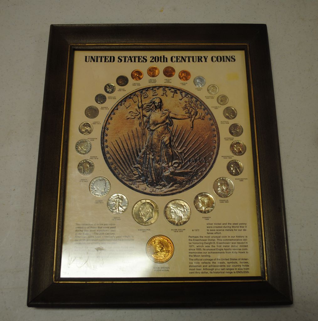 United States 20th Century coins. Coins used during the 20th century in attractive matte and frame. W. 13 1/2 ", H. 16 1/2" United States 20th Century coins. Coins used during the 20th century in attractive matte and frame. W. 13 1/2 ", H. 16 1/2"