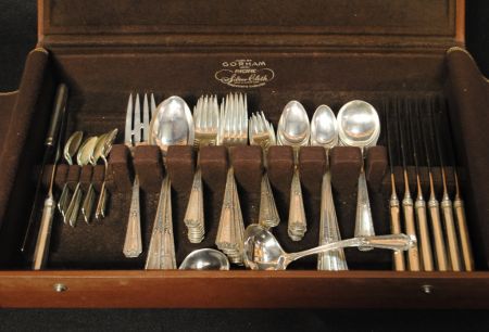 Set of Sterling Silver Flatware by Towle in pattern "Louis XIV pat. 1924, includes: 8 knives, 8 bouillon spoons, 8 ice teaspoons, 8 teaspoons, 8 cocktails forks, 8 dinner forks, 8 salad forks, 2 serving spoons, 8 demitasse spoons, ladle, meat fork, sugar spoon. 69 pcs. Set of Sterling Silver Flatware by Towle in pattern "Louis XIV pat. 1924, includes: 8 knives, 8 bouillon spoons, 8 ice teaspoons, 8 teaspoons, 8 cocktails forks, 8 dinner forks, 8 salad forks, 2 serving spoons, 8 demitasse spoons, ladle, meat fork, sugar spoon. 69 pcs.