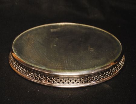 Pairpoint Manufacturing Co. silverplate plateau mirror. Scalloped edge mirror in fretwork silverplate frame. Dia. 12 1/2" Pairpoint Manufacturing Co. silverplate plateau mirror. Scalloped edge mirror in fretwork silverplate frame. Dia. 12 1/2"
