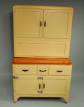 Early 20th century painted green Hoosier cabinet. Top has two doors-interior flour bin, slide up storage door. Base has wood top, three drawers over tow doors. H.69", W. 40", Dia. 22" Early 20th century painted green Hoosier cabinet. Top has two doors-interior flour bin, slide up storage door. Base has wood top, three drawers over tow doors. H.69", W. 40", Dia. 22"