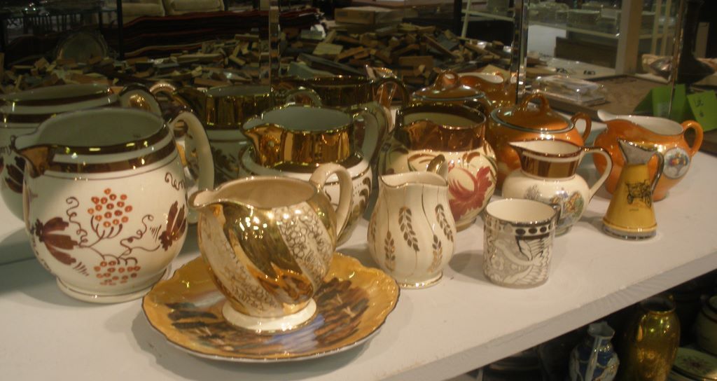 Lot consisting of lusterware including pitchers, sugar and creamer, cup and plate Lot consisting of lusterware including pitchers, sugar and creamer, cup and plate