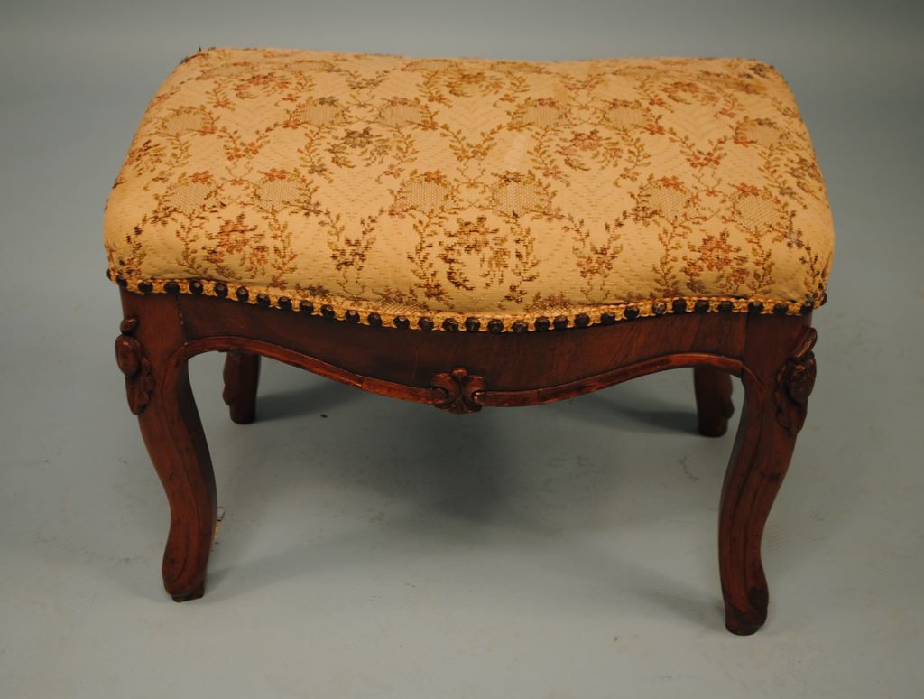 Mid 19th century walnut Victorian footstool with tapestry H. 15", W. 23". D. 16" Mid 19th century walnut Victorian footstool with tapestry H. 15", W. 23". D. 16"