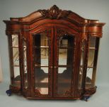 Large Mahogany Contemporary Lighted Display Cabinet. Bonnet top with carved cartouche, two beveled glass doors with smaller beveled glass sections on each side that do not open, rounded opening beveled glass doors at each end, has glass interior shelves. H. 65" W. 76 1/2" D. 22" Large Mahogany Contemporary Lighted Display Cabinet. Bonnet top with carved cartouche, two beveled glass doors with smaller beveled glass sections on each side that do not open, rounded opening beveled glass doors at each end, has glass interior shelves. H. 65" W. 76 1/2" D. 22"