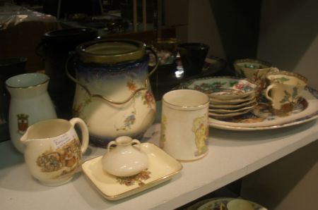 Lot includes oriental English transferware platter, Coalport cup and saucers, biscuit jar and souvenir items Lot includes oriental English transferware platter, Coalport cup and saucers, biscuit jar and souvenir items