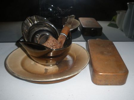 Lot includes copper flask, pipe, painted plate of Washington, ashtray, tape measurer Lot includes copper flask, pipe, painted plate of Washington, ashtray, tape measurer