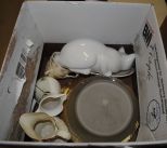 Lot includes satin glass bowl, covered dish, cups, porcelain cat Lot includes satin glass bowl, covered dish, cups, porcelain cat