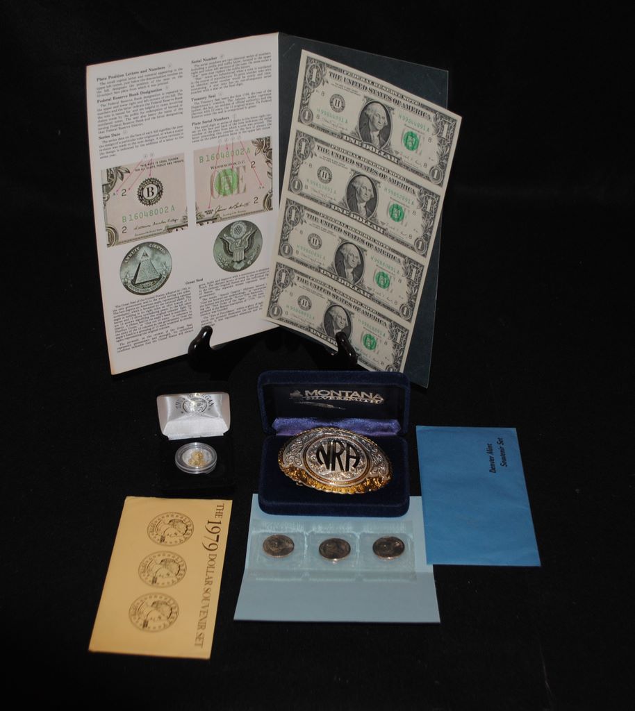 Lot including NRA (limited edition) belt buckle, Morgan mint (Liberty 2000 coin) 1979 and 1980 Susan B. Anthony dollar coins. Denver Mint - souvenir coin set, set of 4 uncut dollars. Lot including NRA (limited edition) belt buckle, Morgan mint (Liberty 2000 coin) 1979 and 1980 Susan B. Anthony dollar coins. Denver Mint - souvenir coin set, set of 4 uncut dollars.