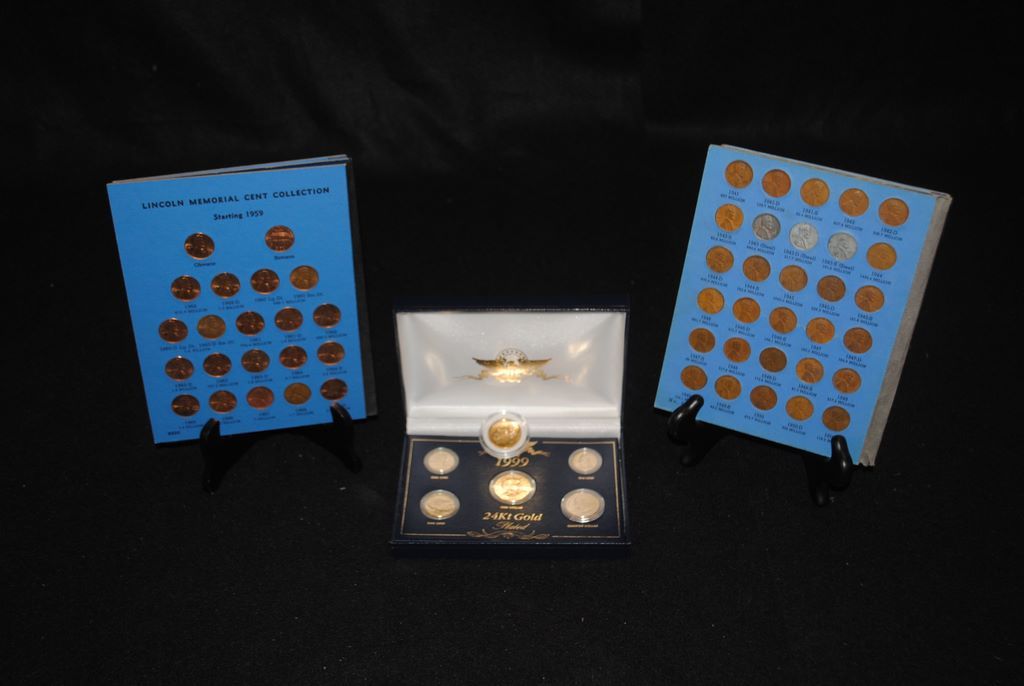 Two collections of Lincoln Memorial Coins in books along with 1999 24kt. Gold plated coins in box. Two collections of Lincoln Memorial Coins in books along with 1999 24kt. Gold plated coins in box.