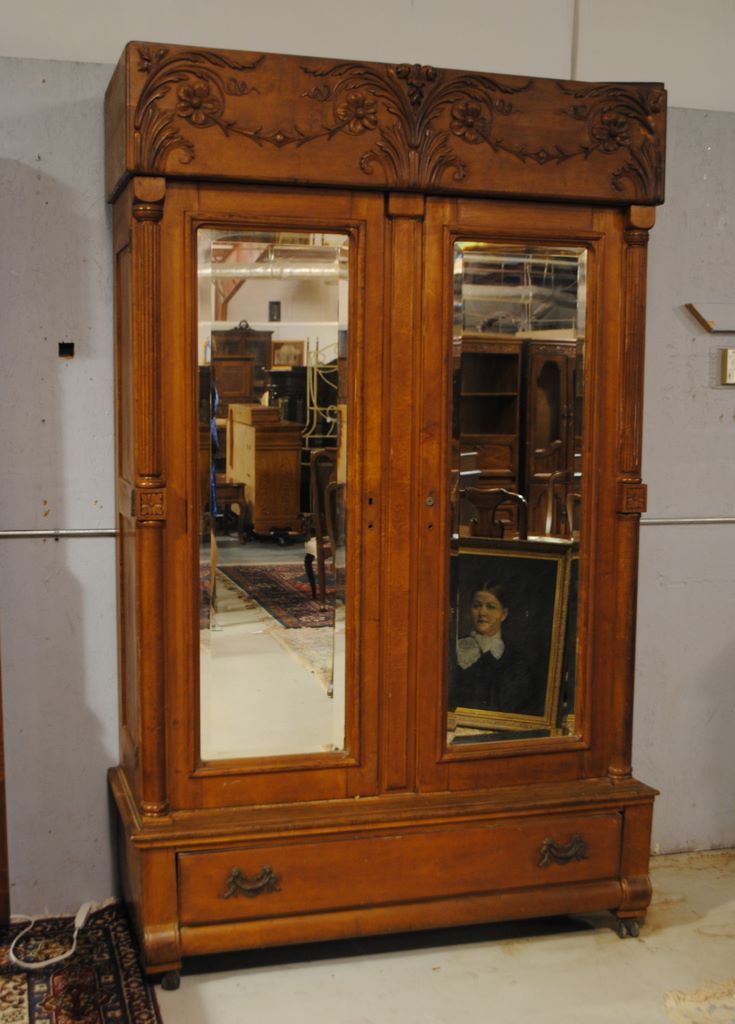 Cherry Bedroom Set Early 20th Century. Consisting of Bed-Ornately Carved headboard, roll on footboard with same carving as headboard. H.85" W. 65" L. 89", Wardrobe has two beveled glass doors, reeded columns, ornately carved cornice, long drawer at base, H. 92" W. 56" D. 24" Cherry Bedroom Set Early 20th Century. Consisting of Bed-Ornately Carved headboard, roll on footboard with same carving as headboard. H.85" W. 65" L. 89", Wardrobe has two beveled glass doors, reeded columns, ornately carved cornice, long drawer at base, H. 92" W. 56" D. 24"