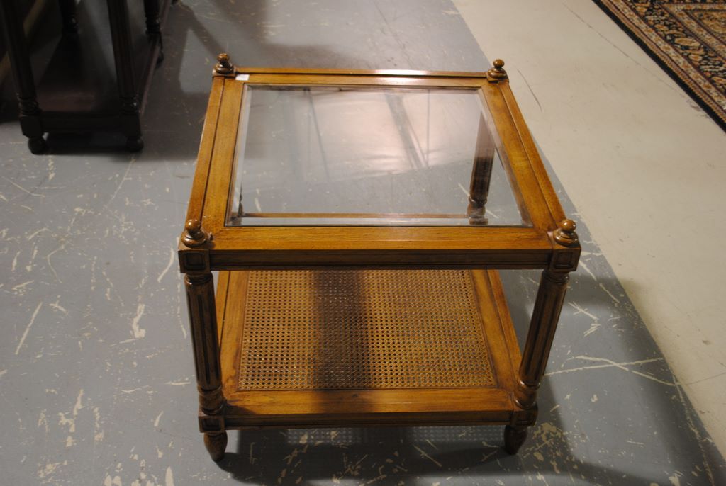 Glass top end table with cane in bottom shelf. 22"h, 25 2/8 Sq. Glass top end table with cane in bottom shelf. 22"h, 25 2/8 Sq.