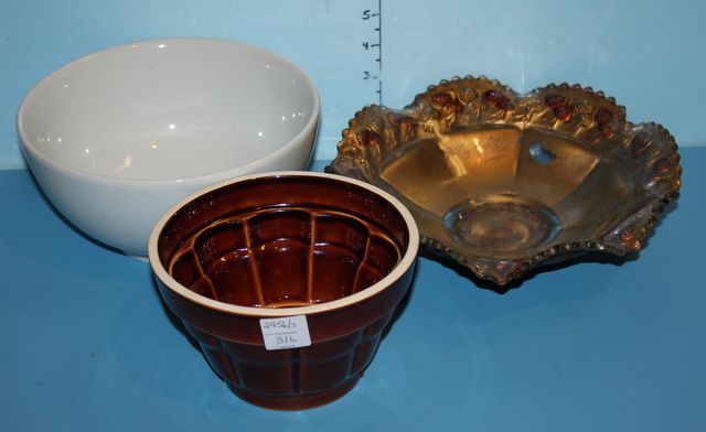 Harvest Design Pottery Mold (6") along with Two Bowls, one white porcelain, one Goofus Glass Fluted bowl 10" dia. Harvest Design Pottery Mold (6") along with Two Bowls, one white porcelain, one Goofus Glass Fluted bowl 10" dia.