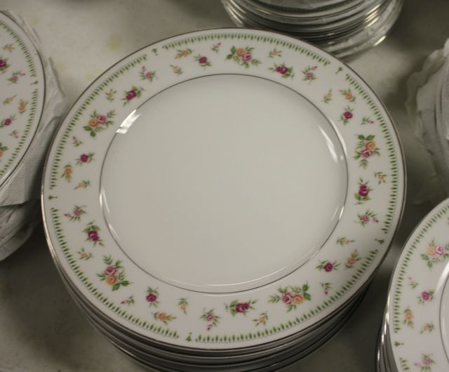 Set of Abingdon China, made in Japan, including; twenty eight dinner plates, sixteen salad plates, twenty five bread and butter plates, nineteen berry bowls, eleven cereal bowls, twenty four saucers, twenty six cups, salt and pepper, two covered sugars, creamer (total of 154 pcs.), few small chips Set of Abingdon China, made in Japan, including; twenty eight dinner plates, sixteen salad plates, twenty five bread and butter plates, nineteen berry bowls, eleven cereal bowls, twenty four saucers, twenty six cups, salt and pepper, two covered sugars, creamer (total of 154 pcs.), few small chips
