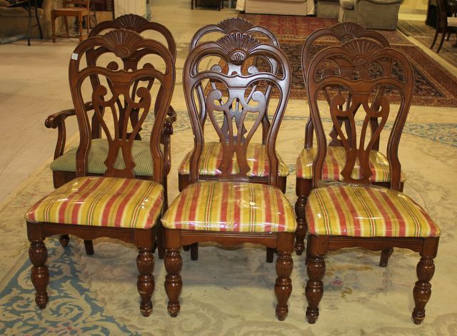Set of Six Dining Chairs, one arm, five sides; 42" h. Set of Six Dining Chairs, one arm, five sides; 42" h.