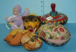 Vintage Tin Spinning Top, Tiger Hand Muppet, Musical Tin Egg (not working) and a China Face Doll 7" Vintage Tin Spinning Top, Tiger Hand Muppet, Musical Tin Egg (not working) and a China Face Doll 7"