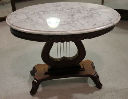 Mid 20th Century Mahogany Marble Top Lyre Base Parlor Table, 33"oval, 27" h. Mid 20th Century Mahogany Marble Top Lyre Base Parlor Table, 33"oval, 27" h.