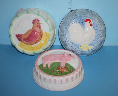 Three Handpainted molds, with hens and pig. 8 1/2" dia. Three Handpainted molds, with hens and pig. 8 1/2" dia.